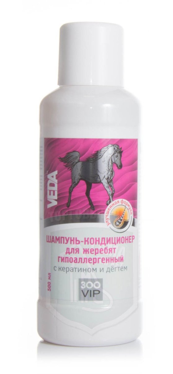 Концентрированный шампунь-кондиционер для жеребят "VEDA", изготовленный на основе мягких моющих средств, обеспечивает профессионально высокое качество гигиенического ухода за жеребятами. В состав входят такие компоненты, как березовый деготь, кератин и коллаген, молочная сыворотка, глицерин, которые благотворно влияют на кожу и волосяной покров.