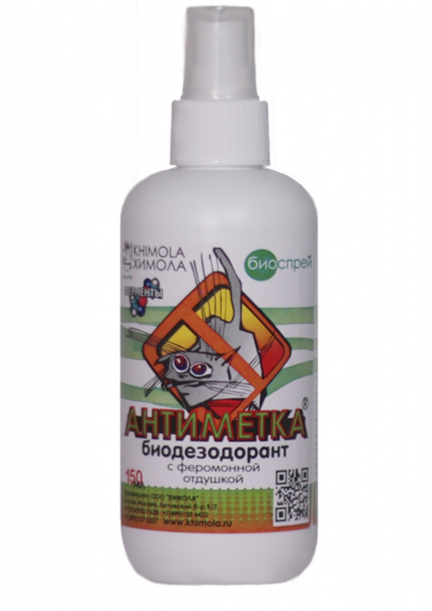 Антиметка спрей - препарат двойного действия, уникальность которого заключается в том, что биодезодорант (ферментная композиция) уничтожает источник чрезвычайно сильного и стойкого мочевого запаха (знак «агрессии»), а входящая в состав препарата отдушка с аналогом феромона кошачьих лицевых желез в тоже самое время создает «дружественный» запах (заменяет агрессивные метки на «дружественные»)