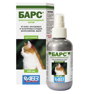 Спрей инсекто-акарицидный Барс является эффективным средством против блох, вшей, власоедов и иксодовых клещей, паразитирующих на собаках и кошках. Спрей относится к умеренно токсичным для теплокровных животных препаратам, в рекомендуемых дозах не оказывает кожно-резорбтивного и сенсибилизирующего действия, при попадании на слизистые оболочки вызывает раздражение.