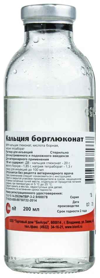 Кальция борглюконат (Calcii borogluconas) - раствор для инъекций применяют с целью профилактики и лечения животных при заболеваниях. По внешнему виду Кальция борглюконат представляет собой прозрачную бесцветную или светло-желтого цвета жидкость.