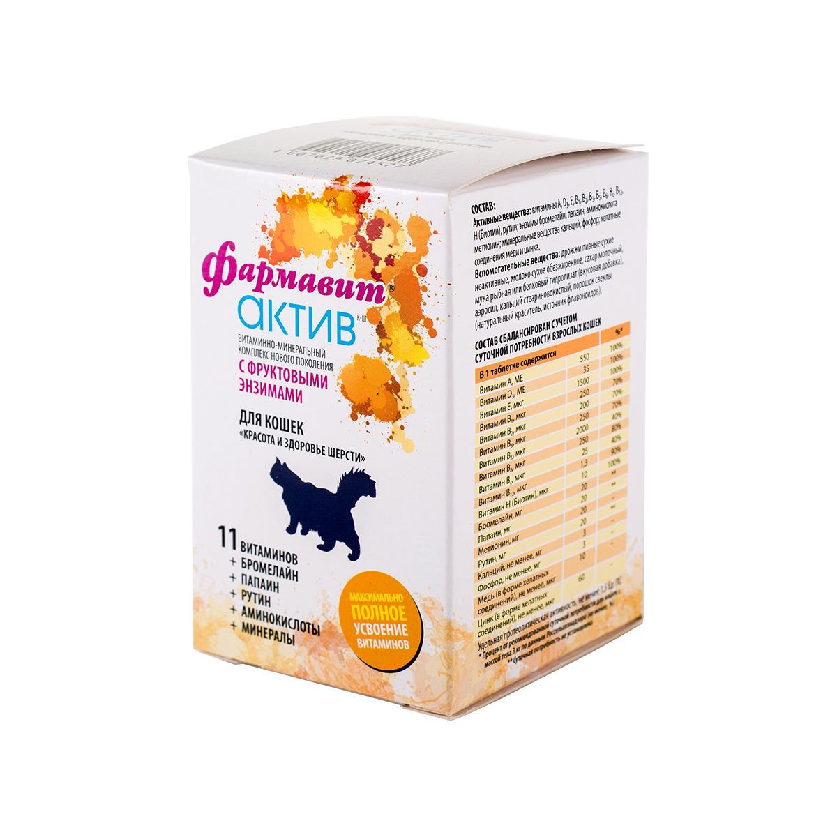 Фармавит Актив – витаминно-минеральный комплекс с фруктовыми энзимами, специально разработанный для улучшения состояния кожи и шерсти кошек.