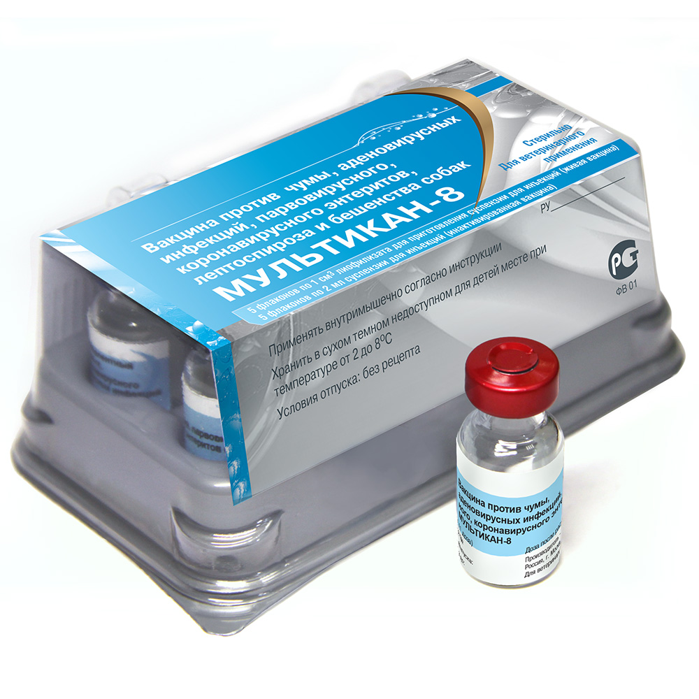 Вакцина Мультикана-8 изготовлена из аттенурованных штаммов вируса чумы собак, аденовируса собак типа 2, парвовируса и коронавируса собак, инактивированнх производственных штаммов лептоспир серогрупп Каникола и Иктерогеморрагия и интактивированного производственного штамма вируса бешенства и предназначена для профилактики болезней, вызываемых этими возбудителями.
