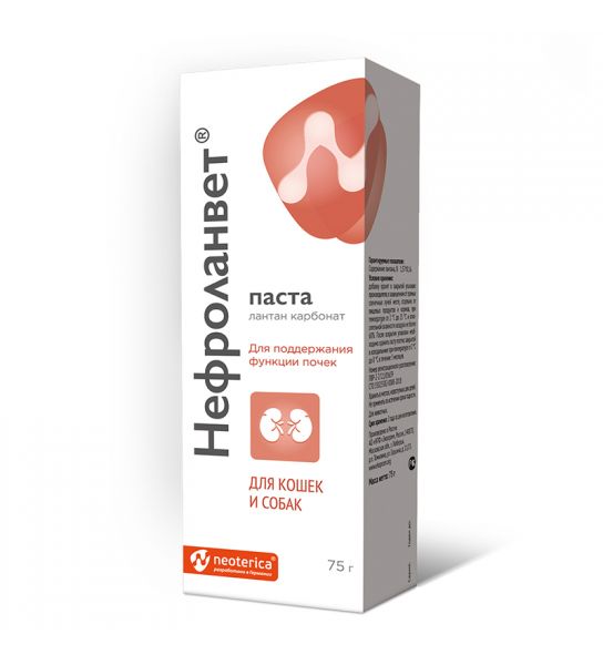 Нефроланвет паста — кормовая добавка для кошек и собак, предназначенная для поддержания функции почек при хронической почечной недостаточности. Содержит лантан, который связывает фосфор в желудочно-кишечном тракте, предотвращая его попадание в почки. Препарат способствует снижению рабочей нагрузки на почки и улучшению общего состояния животного.