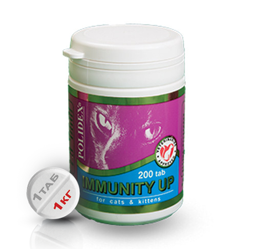 POLIDEX Immunity Up» (Полидэкс Иммунити Ап) для кошек предназначен для повышения иммунитета ослабленных и часто заболевающих кошек. Особо рекомендован к применению перед вакцинацией, а так же в послеродовой период, совместно с Multivitum (Полидекс Мультивитум) для взрослых кошек, так как после родов, организм кошки ослаблен и подвержен в первую очередь вирусным инфекциям, на фоне снижения иммунитета.