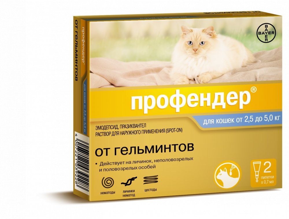 Профендер обладает широким спектром антигельминтного действия на круглых и ленточных гельминтов, в т. ч. Тохосаra саti, Toxascaris leoninа, Ancylostoma tubaeforme, Echinococcus multilocularis, Dipylidium caninum, Taenia taeniaeformis, паразитирующих у кошек.