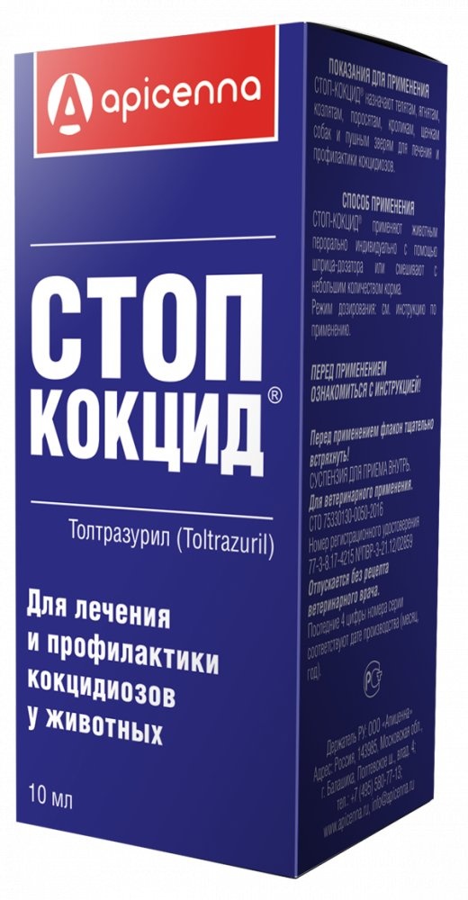 суспензия для орального применения. Стоп-кокцид в 1 мл в качестве действующего вещества (ДВ) содержит толтразурил - 50 мг, а также вспомогательные вещества: бензоат натрия – 1,5 мг, карбоксиметилцеллюлозу –1,5 мг, цикламат – 0,67 мг, сахарин – 0,67 мг, аспартам – 0,67 мг, лактозу – 2 мг, полипропиленгликоль – 100 мг, твин-80 – 6 мг, аэросил – 6 мг и воду дистиллированную – до 1 мл.