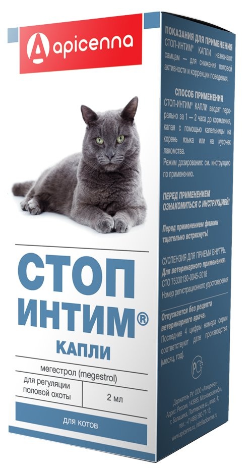 8. Стоп-Интим® капли назначают для регуляции половой охоты у кошек и собак, в том числе для задержки и прерывания течки у самок кошек и сук, снижения половой активности и коррекция поведения у котов и кобелей.