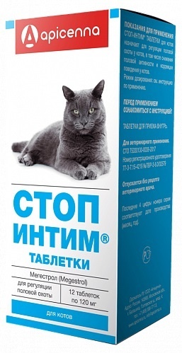 Стоп-Интим таблетки для кошек назначают для регуляции половой охоты у кошек, в том числе для задержки и прерывания течки у самок кошек, снижения половой активности и коррекция поведения у котов.