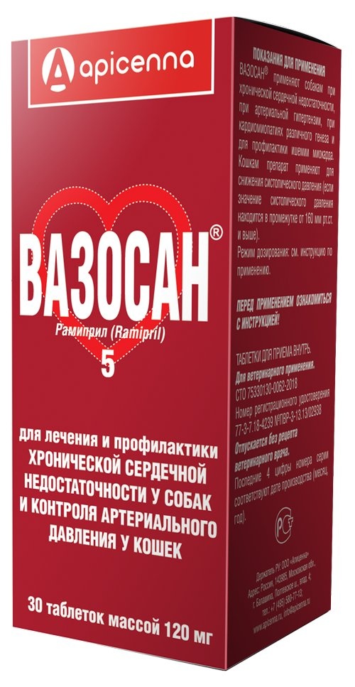 ВАЗОСАН — препарат для лечения и профилактики хронической сердечной недостаточности у собак и контроля артериального давления у кошек.