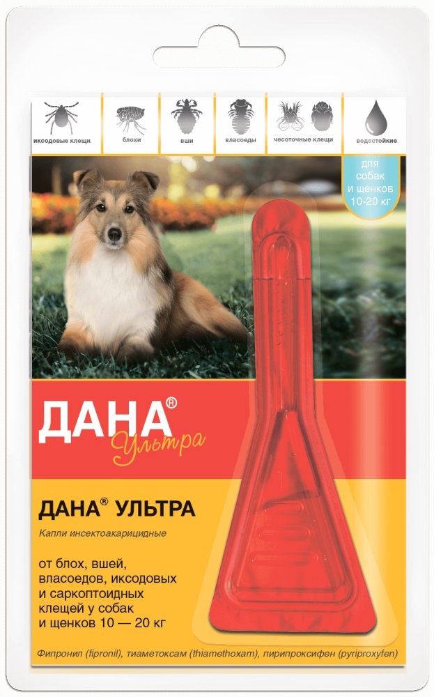 После нанесения препарата на кожу животному его активные компоненты, практически не всасываясь в системный кровоток, быстро распределяются по поверхности тела, накапливаются в эпидермисе, волосяных луковицах и сальных железах, оказывая длительное контактное инсектоакарицидное действие. Продолжительность защитного действия препарата против блох, вшей и власоедов составляет 6 – 8 недель, против иксодовых клещей – 3 – 4 недели. Дана Ультра по степени воздействия на организм относится к веществам умеренно опасным (3 класс опасности по ГОСТ 12.1.007-76), в рекомендуемых дозах не оказывает кожно-раздражающего, резорбтивно-токсического и сенсибилизирующего действия, при попадании в глаза вызывает слабое раздражение. Препарат токсичен для пчел, а также рыб и других гидробионтов.