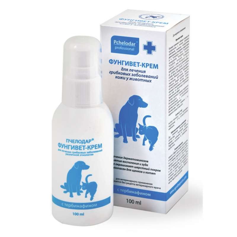 Входящий в состав тербинафин оказывает фунгицидное действие в отношении дерматофитов (Trichophyton rubium, T.mentagrophytes, T.verrucosum, T.violaceum, T.tonsurans, Microsporum canis, Epidermophyton floccosum), плесневых (в основном, C.albicans) и определенных диморфных грибов (Pityrosporum orbiculare). Активность в отношении дрожжевых грибов, в зависимости от их вида, может быть фунгицидной или фунгистатической. Экстракт прополиса благодаря своему сложному биологическому составу обладает разносторонним действием: бактериостатическим, противогрибковым, анестезирующим, противовоспалительным, противозудным. Фунгивет не оказывает влияния на систему цитохрома Р450 у животных и, соответственно, на метаболизм гормонов или других лекарственных препаратов. При местном применении абсорбция менее 5%, оказывает незначительное системное действие.