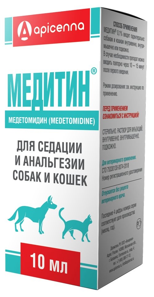 В случае необходимости препарат можно вводить повторно через 10-15 минут после первого введения. Для достижения седативного и анальгезирующего эффектов у лошадей Медитин 1% применяютв дозе 0,2-1,2 мл/100 кг. Собакам Медитин 0,1% применяют в дозе 0,1-0,8 мл/10 кг массы тела,кошкам Медитин 0,1% применяют в дозе 0,01-0,15 мл/кг массы тела. Дозы препарата варьируют в зависимости от требуемого эффекта, индивидуальных особенностей и породы животного. Для собак мелких пород требуется более высокая доза Медитина 0,1%, чем крупным собакам.Лошадям препарат вводят внутривенномедленно (1 мл в минуту). Рекомендуется использовать 2 стерильных иглы: одну для наполнения шприца из флакона, другую непосредственно для инъекции. Как только необходимая доза препарата набрана в шприц, следует отсоединить его от иглы, находящейся во флаконе. Инъекционная игла вводится животному, и лишь затем шприц с препаратом подсоединяется к ней.