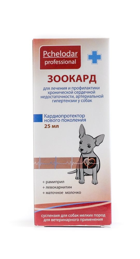 Фармакотерапевтическая группа: Ингибиторы АПФ. Активные компоненты Зоокарда оказывают антигипертензивное, вазодилатирующее и кардиопротективное действие. Рамиприл – гипотензивное средство, ингибитор ангиотензин-превращающего фермента. Механизм антигипертензивного действия связан с конкурентным ингибированием активности АПФ, которое приводит к снижению скорости превращения ангиотензина I в ангиотензин II, являющегося мощным сосудосуживающим веществом. Уменьшает давление в легочных капиллярах и сопротивление в легочных сосудах; повышает минутный объем сердца и выносливость к нагрузке. У животных с признаками хронической сердечной недостаточности, после инфаркта миокарда рамиприл снижает риск внезапной смерти и прогрессирование сердечной недостаточности. Значительно уменьшает частоту инфаркта миокарда и инсульта у животных. Понижает общее сосудистое периферическое сопротивление, замедляет возникновение и прогрессирование хронической сердечной недостаточности, снижает общую смертность животных. Оказывает антигипертензивное действие, не вызывая компенсаторной тахикардии. Эффективность рамиприла не зависит от пола, возраста и массы тела животного. Рамиприл значительно снижает имеющуюся микроальбуминурию и риск развития нефропатии. Эти эффекты отмечаются у животных, как с повышенным, так и с нормальным артериальным давлением. Гипотензивный эффект рамиприла развивается примерно через 1-2 ч, достигает максимума в пределах 3-6 ч, продолжается не менее 24 ч. L-карнитин является аминокислотой, которая имеет большое значение в процессе энергетического метаболизма миокарда и необходима для поддержания нормальной сердечной деятельности у животных. L-карнитин транспортирует высокомолекулярные жирные кислоты в митохондрии, а также для бетаокисления и синтеза АТФ, за счет чего, сердце получает большую часть требуемой энергии. L-карнитин повышает выносливость при высоких физических нагрузках, а также оказывает регенерирующее и антигипоксическое действие. Пчелиное маточное молочко – это биогенный стимулятор, который необходим при нарушениях кровоснабжения сердца, сопровождающихся болезненными приступами стенокардии, тяжестью в сердечной области при сердечной недостаточности. Способствует нормализации обмена веществ, повышению иммунитета и быстрому восстановлению организма. После приема внутрь 50-60% препарат быстро всасывается из желудочно-кишечного тракта. Прием пищи не замедляет всасывание. Максимальная концентрация в сыворотке крови достигается через 1-4 часа. Зоокард выводится из организма теплокровных животных через почки (60%) и, преимущественно в виде метаболитов, с калом (40%), поэтому отсутствует угроза передозировки при патологии печени или почек. По степени воздействия на организм относится к малоопасным веществам (4 класс опасности по ГОСТ 12.1.007-76). В рекомендуемых дозах не оказывает эмбриотоксического, тератогенного, сенсибилизирующего и мутагенного действия.